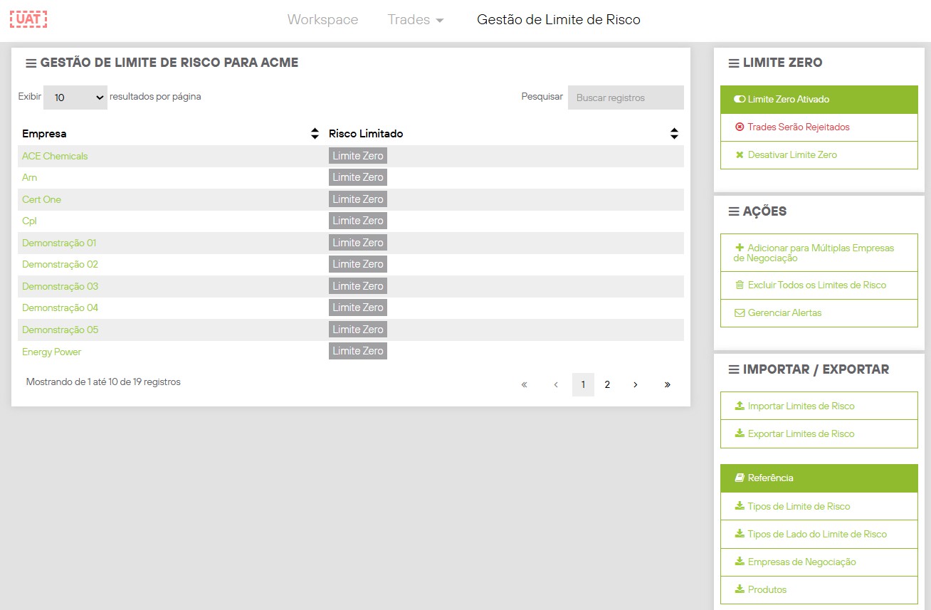 O sistema de importação de arquivos .csv foi aprimorado. Agora, em vez de preencher a planilha com IDs numéricos (ex: "4582"), você pode utilizar nomes para as colunas "Contraparte", "Produtos" e "Tipo de Limite de Risco".