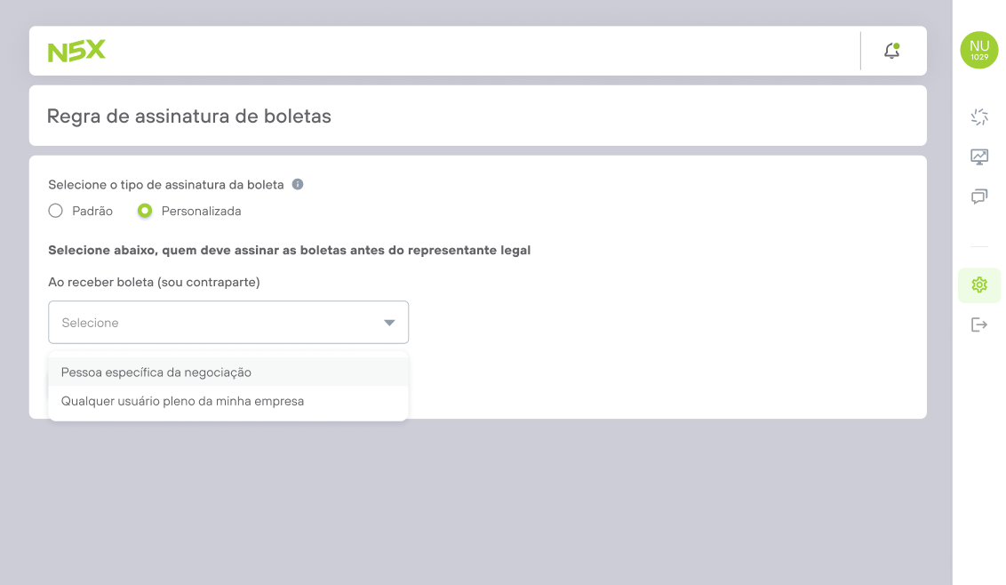 Dessa forma, ao receber uma Boleta como contraparte, o Representante Legal da sua empresa vai receber a Boleta para assinatura somente após validação do usuário selecionado durante a personalização da regra de assinatura.