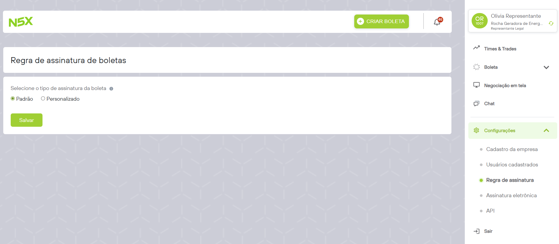 Regra Personalizada: o Representante Legal tem acesso apenas às boletas que já foram validadas previamente pela mesa, focando exclusivamente no fechamento do negócio e evitando retrabalho.