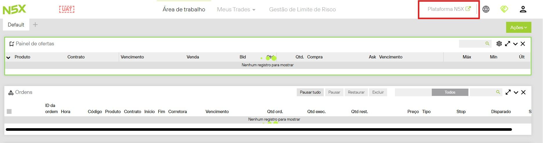 Visando otimizar a navegação entre páginas, reposicionamos o botão que direciona da Tela N5X para a Plataforma N5X. Essa mudança simplifica o menu do usuário — que agora unifica as opções de preferência (como tema escuro, configurações da conta, troca de usuário e logout) — e facilita o acesso à página principal a partir da tela de negociação.