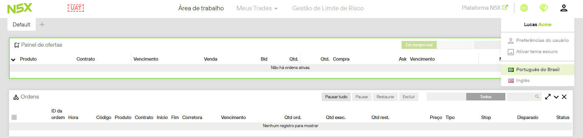 Implementamos traduções adicionais do inglês para o português no ambiente da Tela N5X. O objetivo é tornar a sua experiência de uso mais consistente, sem limitar opções: você ainda pode manter a tela de negociação totalmente em inglês, selecionando seu idioma de preferência através do ícone de usuário.